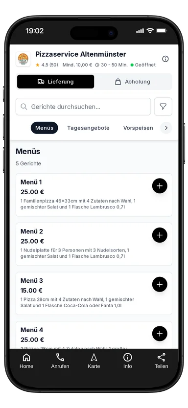 2 Pizzas 28cm mit 4 Zutaten nach Wahl, 1 großer gemischter Salat und 1 Flasche Lambrusco 0,7l